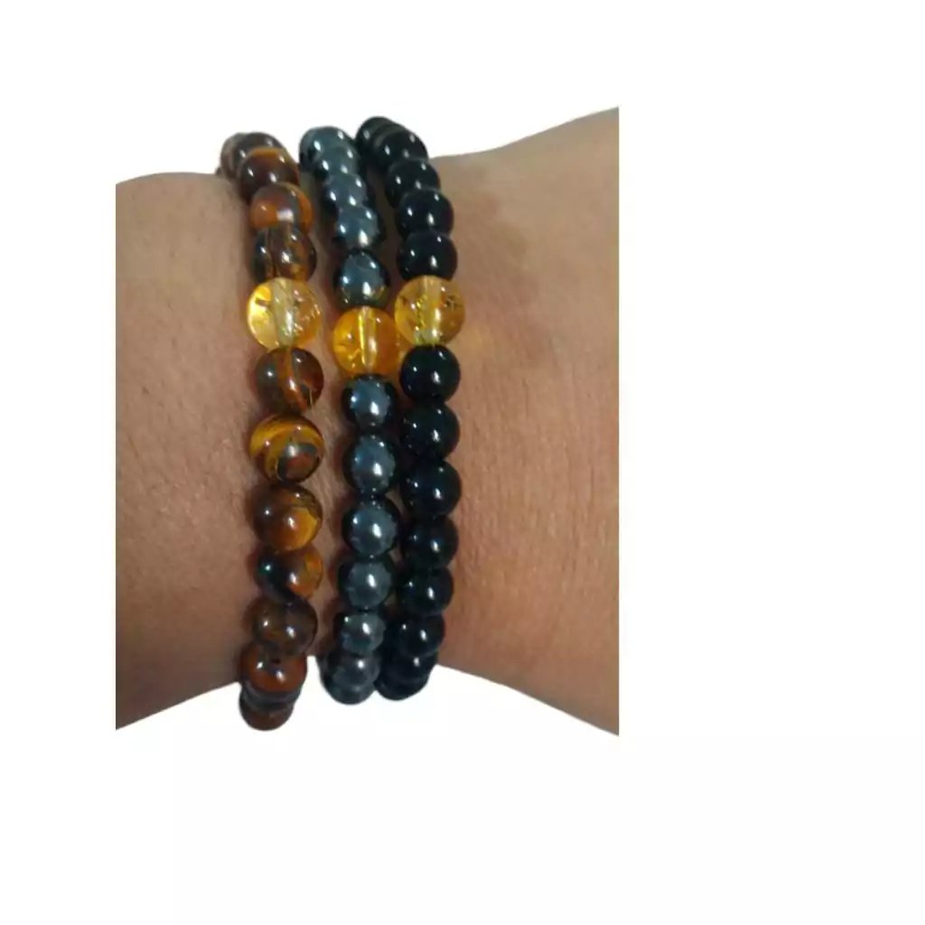 Kit Pulseiras Ônix, Olho de Tigre e Hematita com detalhe Citrino 6mm