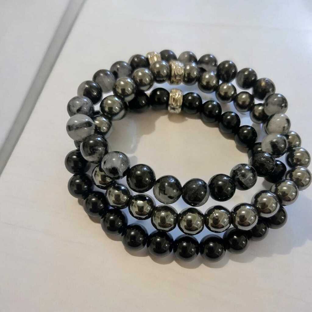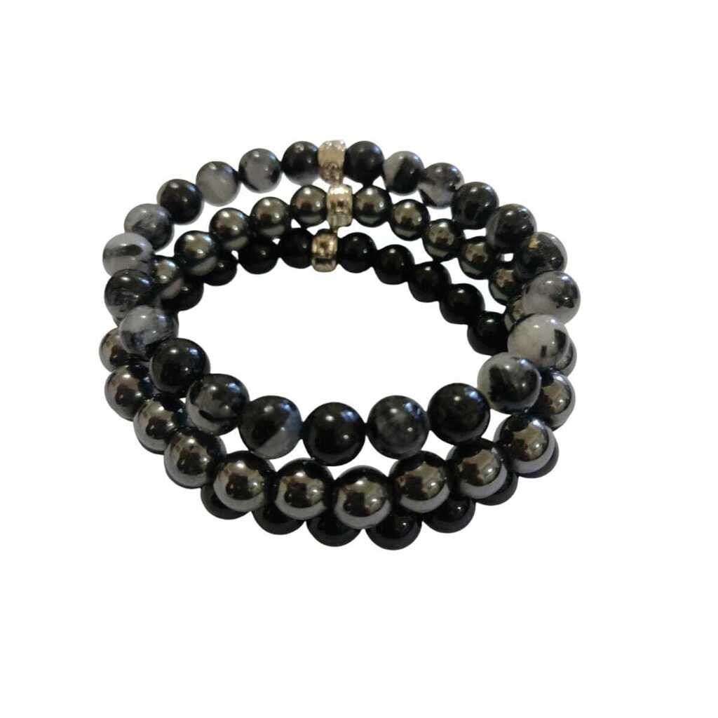 Kit 3 Pulseiras Quartzo Turmalinado, Hematita e Ônix contas 8mm