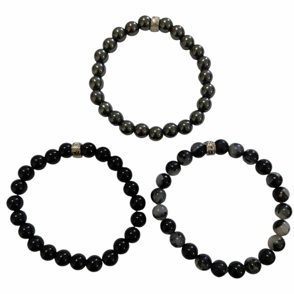 kit 3 Pulseiras Quartzo Turmalinado, Hematita e Ônix 8mm